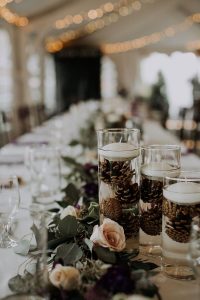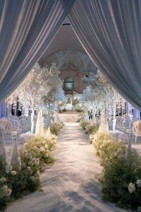 Since you are looking to pay tribute to winter and romance, accents in white light that imitate snow, ice, or stars are an excellent option, but without going overboard, so that the environment does not become too cold. Some soft shades of violet will also be perfect for creating the best atmosphere and will create subtle nuances on the elegant updo during the married couple’s first dance.